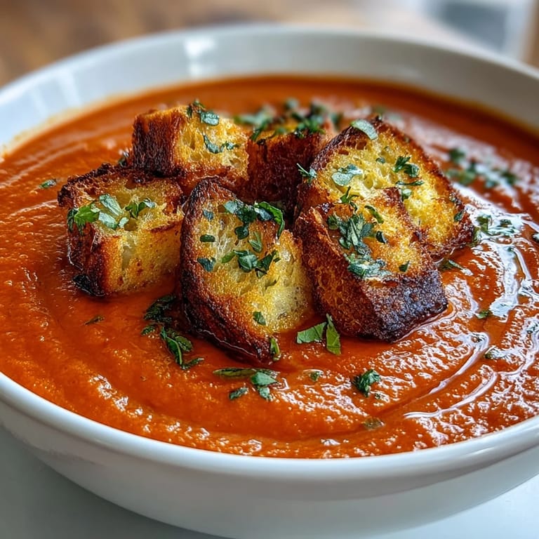 - Ladle the hot soup into bowls and top generously with those crispy croutons you have been trying not to snack on. Finish with fresh herbs and maybe a tiny swirl of extra harissa or cream on top.